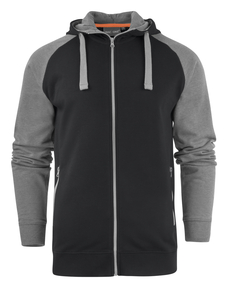 Tweekleurige hoodie met voorzakken. Binnenzijde is geborsteld. Ribbord aan manchetten en boord onderaan. Wasbaar op 60°.