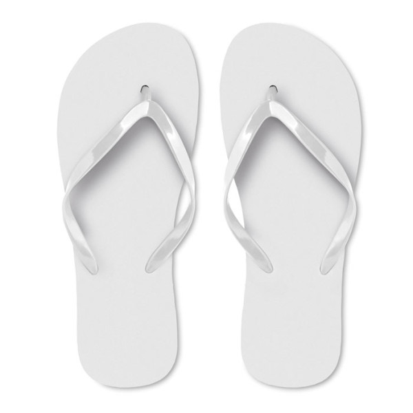 Strandslipper met polyethylene zool en PVC bandje. In twee maten verkrijgbaar. M is geschikt voor maat 36-39 en L voor maat 40-43.