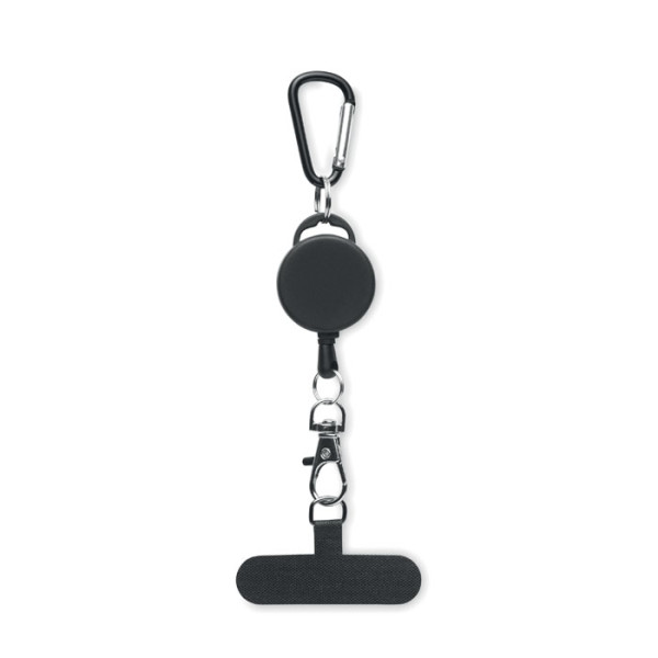 Intrekbare telefoonhouder en/of badgehouder in ABS met aluminium karabijnhaak. De karabijnhaak is niet geschikt voor klimmen (niet-professioneel gebruik).