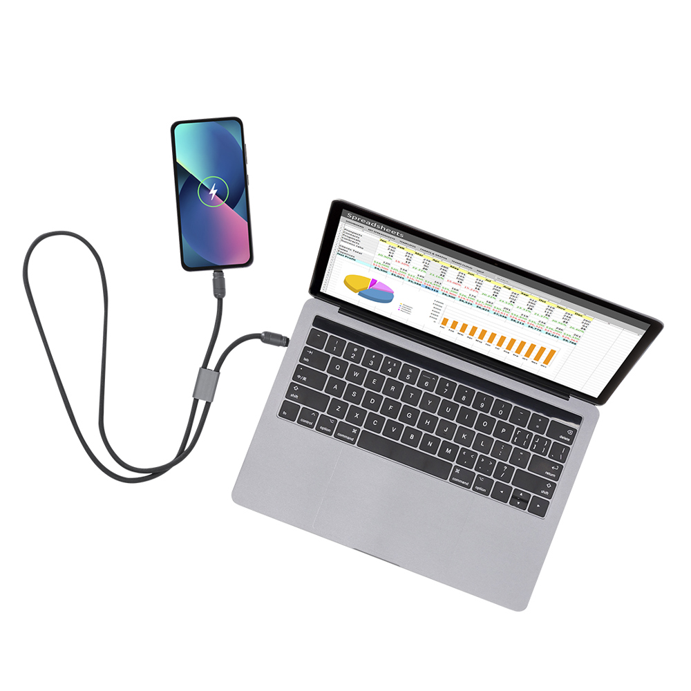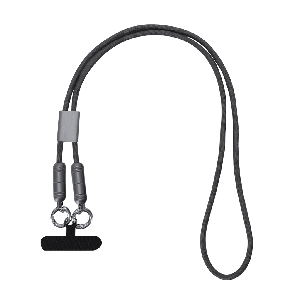 Polsband-oplaadkabel met dataoverdrachtfunctie en telefoonstandaard. Met Type-C in-/uitgang en 60W capaciteit, voor snel opladen. Functionaliteit en gemak in één accessoire.