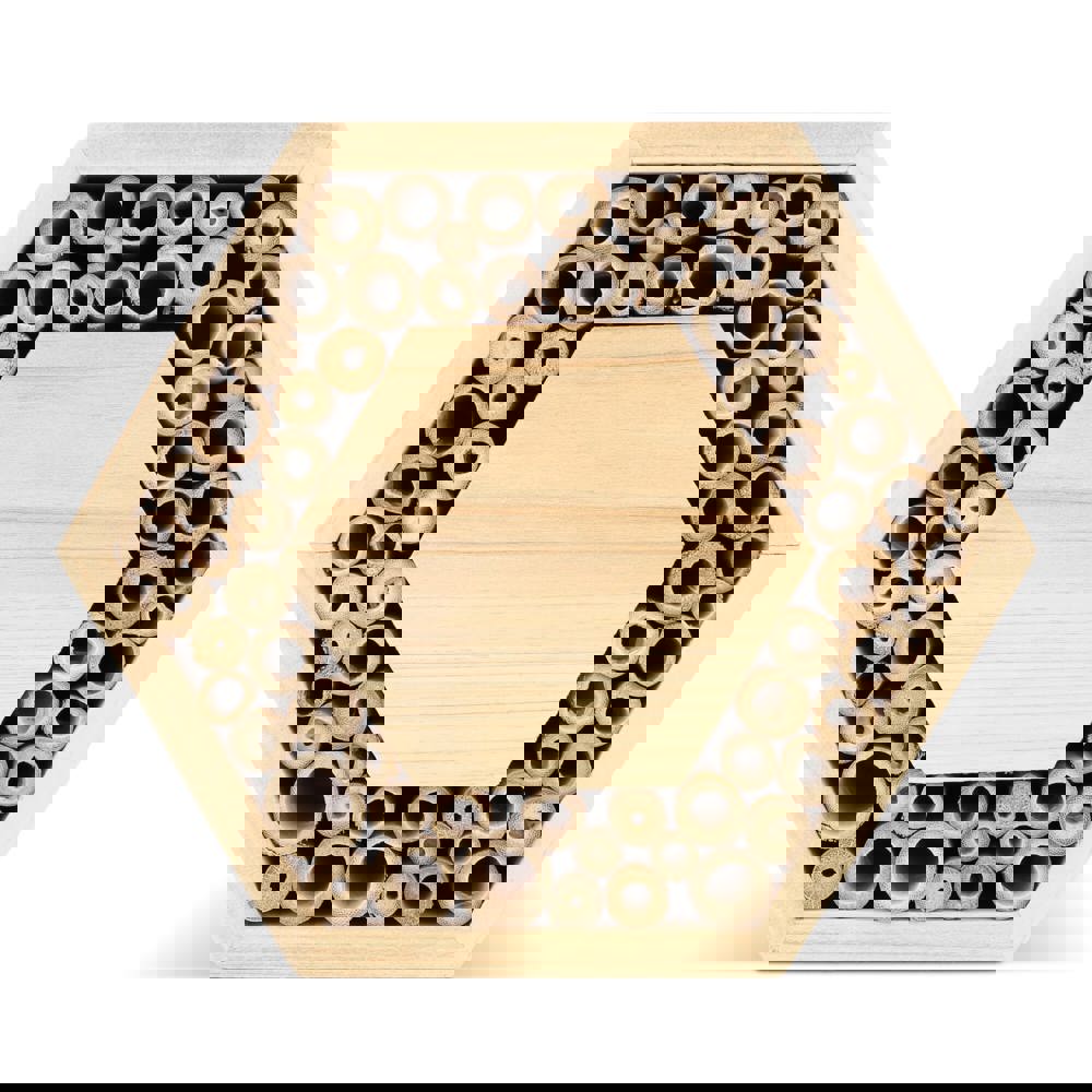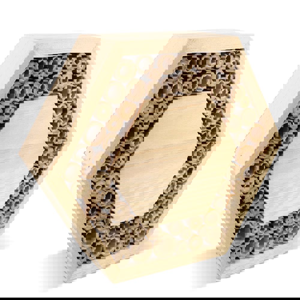 Zeshoekig bijenhuisje gemaakt van FSC-hout met groot centraal drukoppervlak. Geschikt voor solitaire bijen zoals metselbijen en bladbijen. Deze onschadelijke bijen zijn essentiële bestuivers die de biodiversiteit in tuinen en groene ruimtes ondersteunen. Een duurzaam en educatief relatiegeschenk.