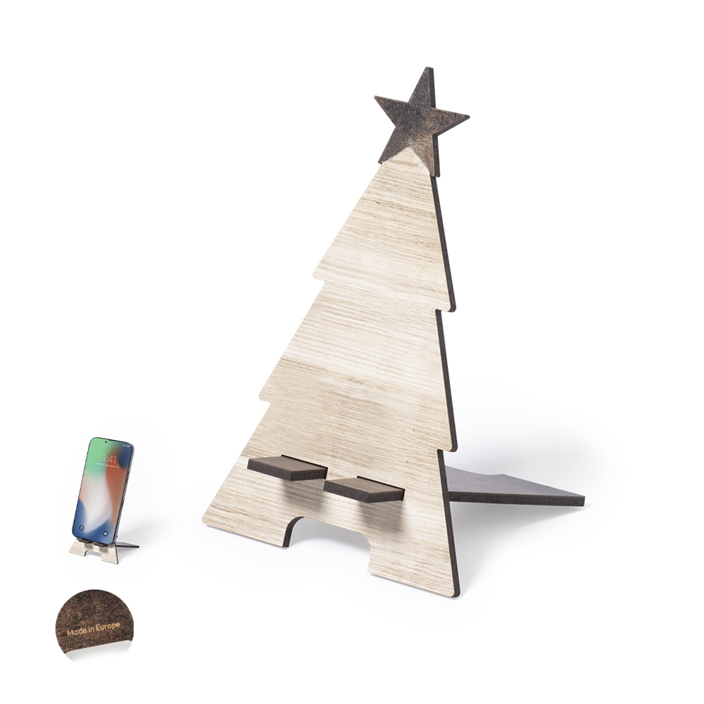 Smartphonehouder met kerstboomdesign, gemaakt van natuurlijk hout en originele tweekleurige afwerking. Gemakkelijk te monteren en met Made In Europe-logo.