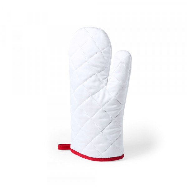Keukenhandschoen van zacht, 100% polyester met een gladde witte afwerking en in 3 gekleurde randen. Met een gladde zijde, speciaal ontworpen voor sublimatie printen en een ophanglus.