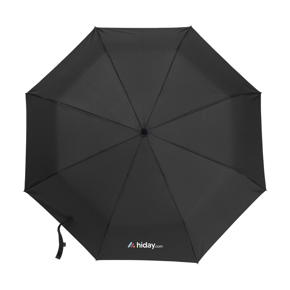 Volautomatische in- en uitklapbare paraplu met 190T RPET pongee polyester bespanning en een comfortabele kunststof handgreep in de vorm van een karabijnhaak. Hiermee kan de paraplu eenvoudig worden opgehangen aan bijvoorbeeld een (rug)tas. Met een schermdoorsnede van 97 cm, metalen steel, glasvezel frame, klittenbandsluiting en opberghoes. Afm. dichtgevouwen: 7 x 6 x 33 cm. RCS-gecertificiceerd. Totaal gereycled materiaal: 15%.