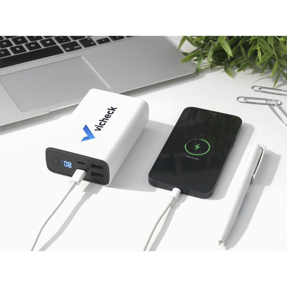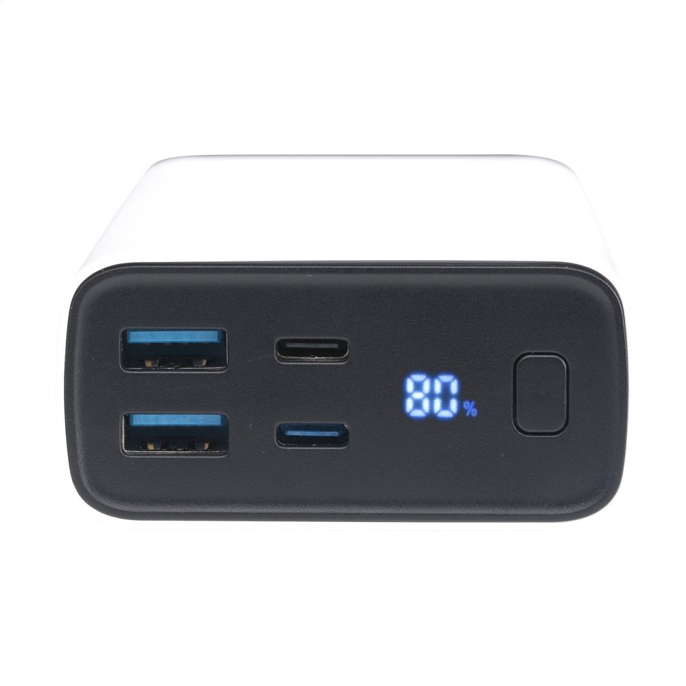 Zeer krachtige powerbank met ingebouwde 20.000 mAh litium-polymeerbatterij. De behuizing is gemaakt van 100% RCS-gecertificeerd gereycled ABS. Met aan/uitknop en een display met batterij-indicatie in procenten. Type-C input: DC5V/3A, 9V/2A, 12/1.5A. Type-C output: DC5V/3A, 9V/2.22A, 12/1.67A. USB-A-output: DC5V/3A, 9V/2A, 12/1.5A. Wired output: 22W. Inclusief rTPE oplaadkabel USB-C naar USB-C en gebruiksaanwijzing. Per stuk verpakt.