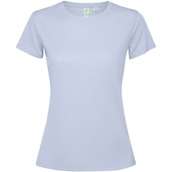 Getailleerd technisch T-shirt met korte mouwen voor dames. Kraag met bijpassende naden. De zoom aan de achterkant is iets langer dan aan de voorkant. Zijnaden naar voren verschoven.