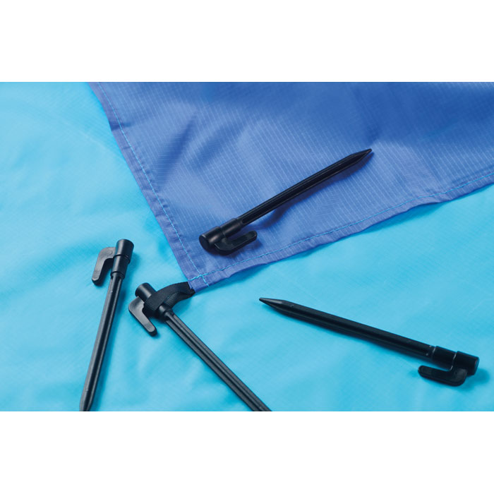 Lichtgewicht strandmat van 210T polyester, afmeting 200x210cm. Inclusief 4 zwarte haken en bijpassende trekkoordzak voor eenvoudig meenemen.