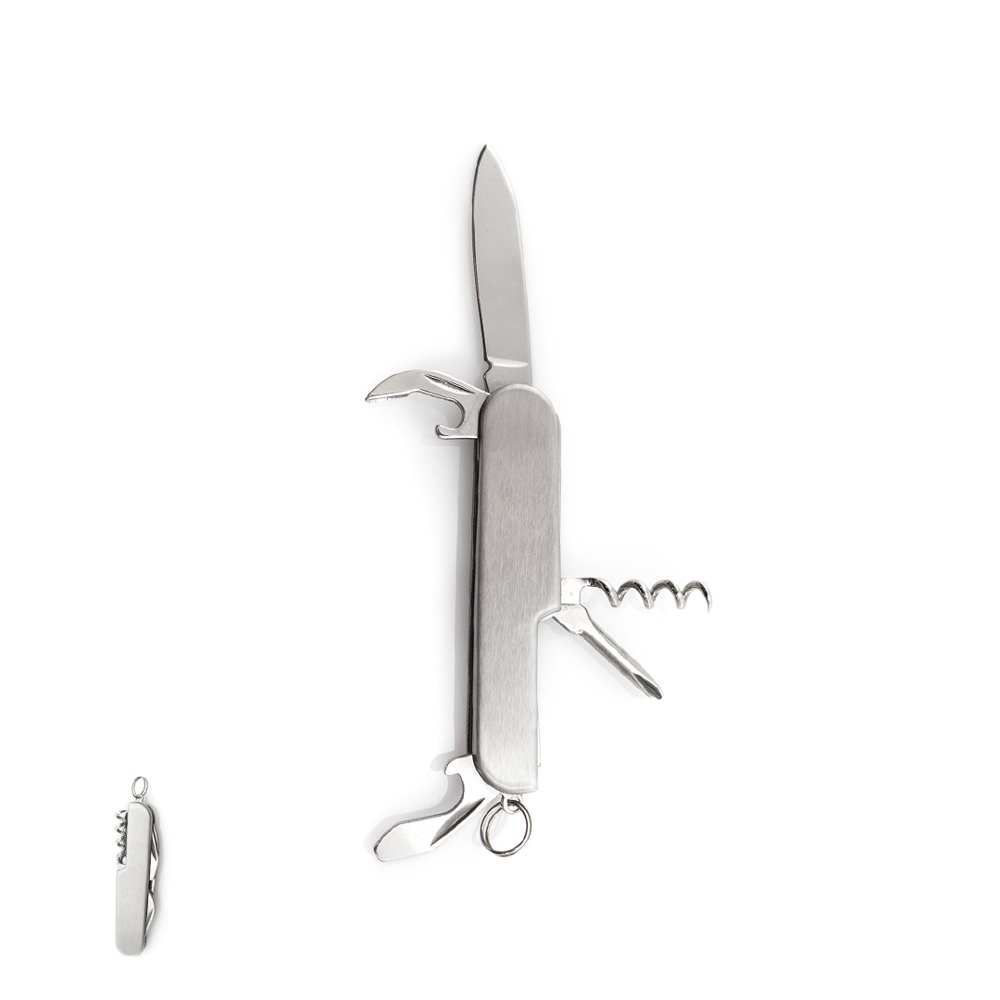 Multifunctioneel roestvrij stalen mes met 6 functies. Inclusief mes, opener, schroevendraaier en sleutelhanger. Gepresenteerd in een individuele doos.