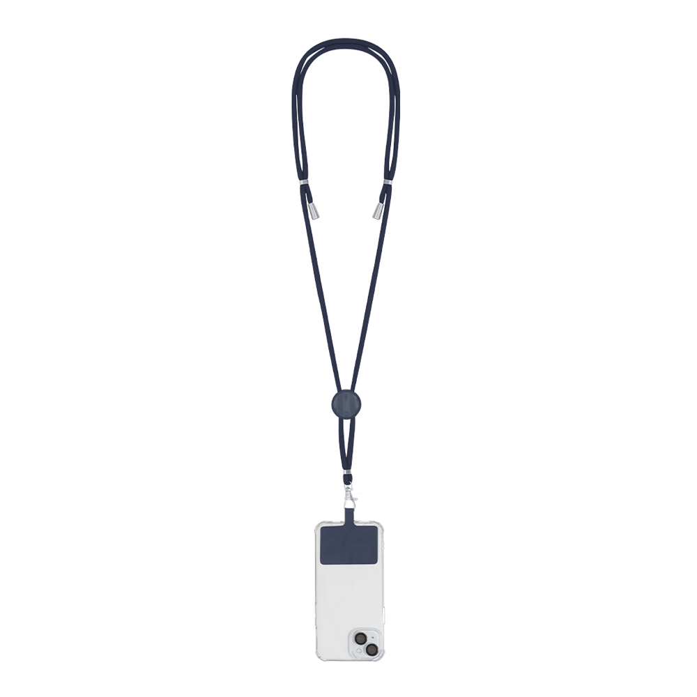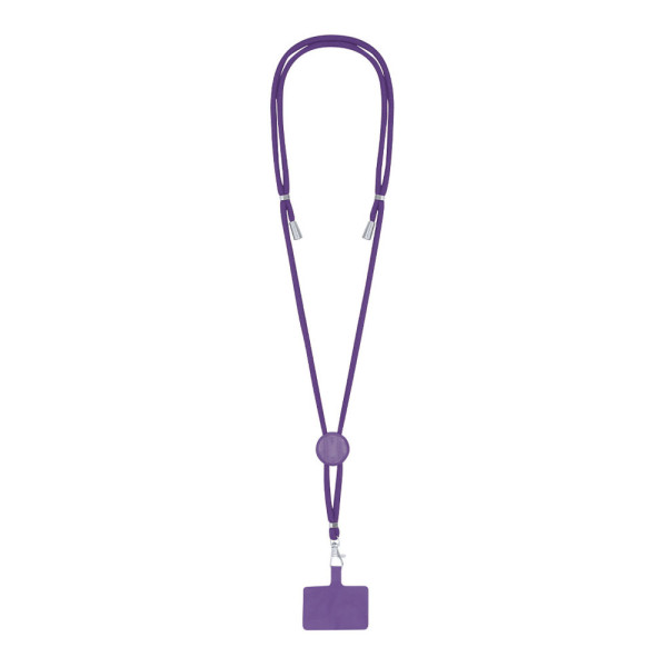 Lanyard met smartphone-accessoire. Gemaakt van duurzaam polyester. Transportaccessoire om tussen hoesje en smartphone te plaatsen, met draaibare metalen karabijnhaak. Verstelbaar bij de nek, met chromen details aan de uiteinden van de koorden.