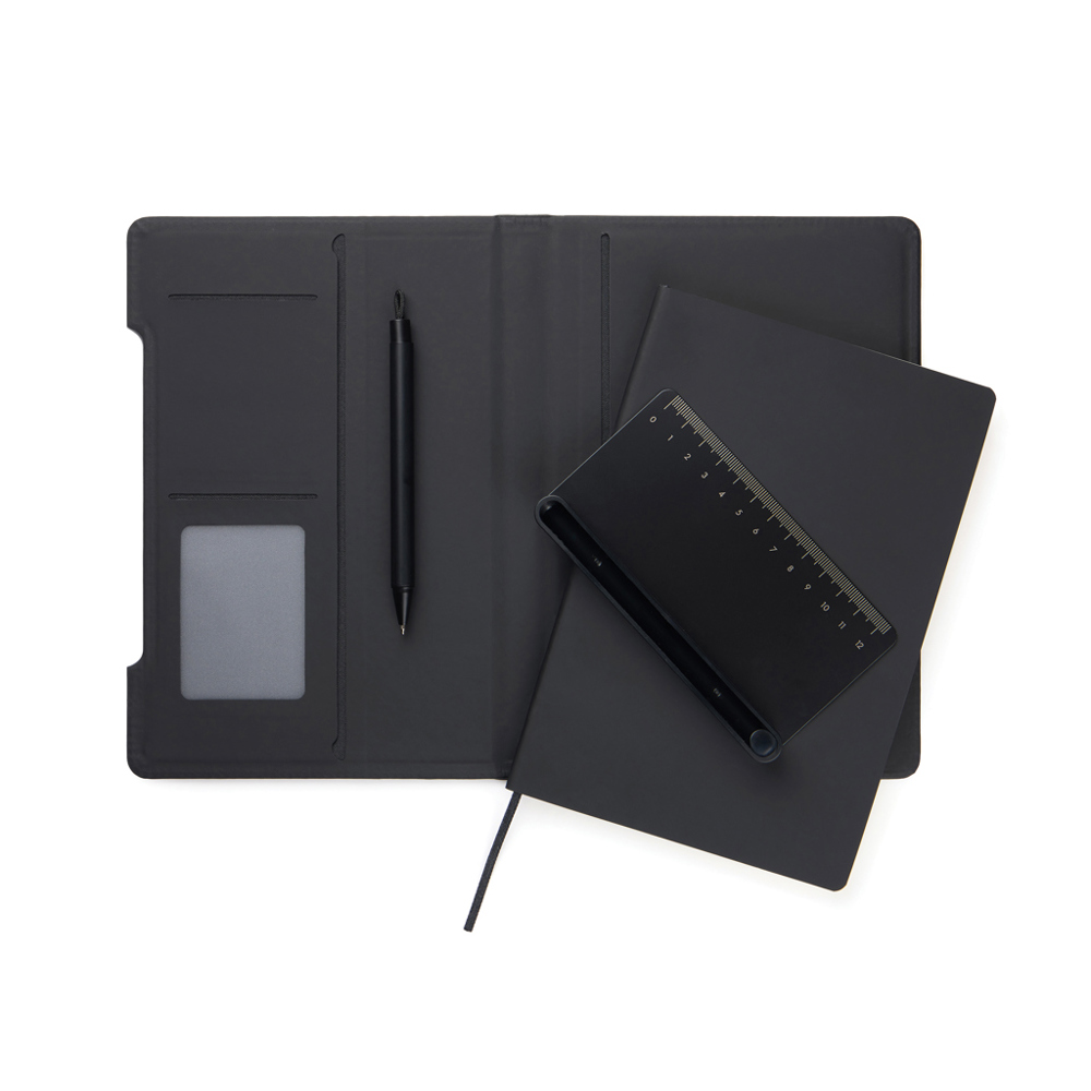 Ontdek het ultieme multifunctionele notitieboek dat je dagelijkse workflow ondersteunt. Deze slimme 4-in-1 oplossing combineert functionaliteit, flexibiliteit en design in één. Gemaakt van RCS-gecertificeerd gerecycled papier met een cover in de klassieke Baltimore matte PU-coating, waardoor het zowel stijlvol als praktisch is. Een magnetische liniaal dient als liniaal en penhouder en wordt geleverd met een bijpassende balpen met blauwe inkt. De penhouder kan eenvoudig worden omgevormd tot een telefoonstandaard die in de structuur van het notitieboek is geïntegreerd. De binnenzijde beschikt over kaarthoudervakken voor handige opslag en een eenvoudig vervangbare notitieboekvulling voor langdurig gebruik. Het notitieboek bevat 80 vellen / 160 gelinieerde pagina’s en biedt voldoende ruimte voor notities, planning en ideeën. Ideaal voor vergaderingen, reizen en dagelijkse organisatie. Totaal gerecycled gehalte: 70% op basis van het totale productgewicht. Gecertificeerd door Control Union.
