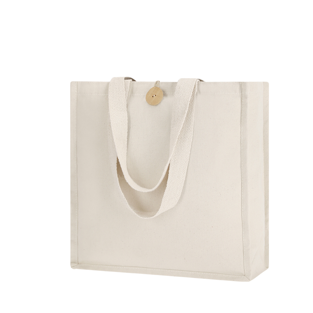 Tas gemaakt van katoen, natuurlijke afwerking en extra gewicht van 310g/m2. Met originele knoopsluiting, gestikte afwerking en kruisje. Extra brede en verstevigde medium handgrepen (60 x 3,5 cm). Weerstand tot 10 kg gewicht.