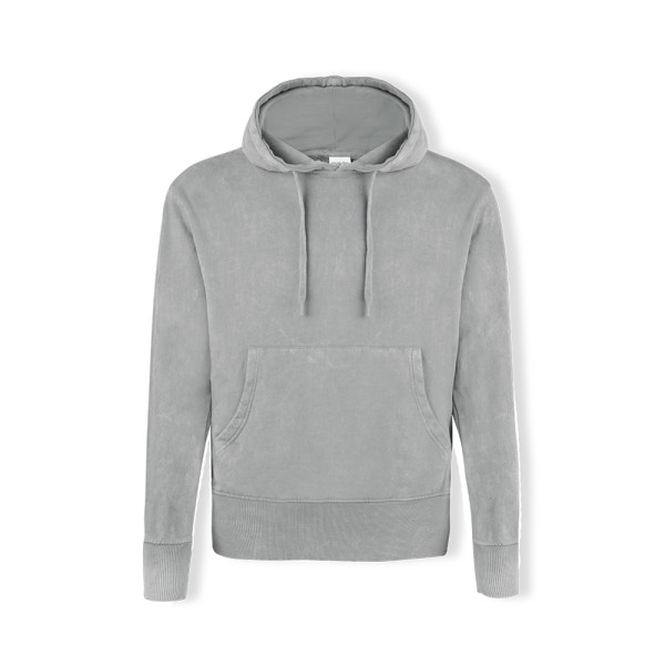 Uniseks sweatshirt met capuchon en gewassen jeanseffect, waardoor elk stuk uniek en onherhaalbaar is. Kangoeroezak, met extra brede elastische banden voor een perfecte pasvorm. Contrastkleur in de elastische banden van manchetten en zoom. Gemaakt van 100% gekamd katoen 280g/m2. Zacht aanvoelend en moderne snit, met verstelbare platte koorden en geborduurde oogjes, waarbij het gebruik van metaal wordt vermeden. Dubbele stiksels voor duurzaamheid en weerstand tegen intensieve slijtage. Eenvoudig verwijderbaar label en verkrijgbaar in de maten XS, S, M, L, XL en XXL.