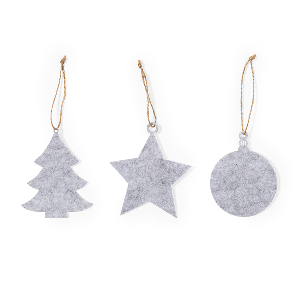 Kerstornamenten set van 3 stuks, gemaakt van zacht vilt. Inclusief 3 ontwerpen: Kerstboom, Ster en Bal. Alle ornamenten met hanger. Gepresenteerd in een gerecycled papieren zakje.
