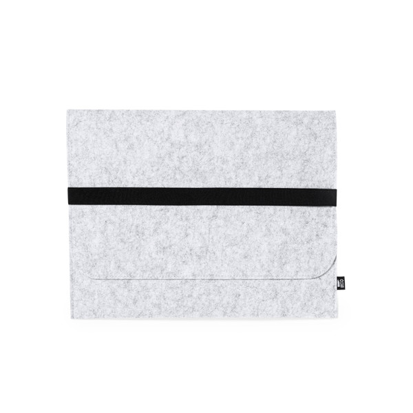Laptophoes van duurzaam gerecycled RPET-vilt. Flap met elastische sluiting en voorvak, met RPET-logo op buitenlabel. Voor laptops tot 15 inch.Het gerecyclede RPET-vilt is het resultaat van de combinatie van het recyclingproces van plastic materialen met de duizendjarige techniek van vilt maken, wat resulteert in een eco-trend materiaal dat niet alleen van gerecyclede oorsprong is, maar ook recyclebaar wordt.