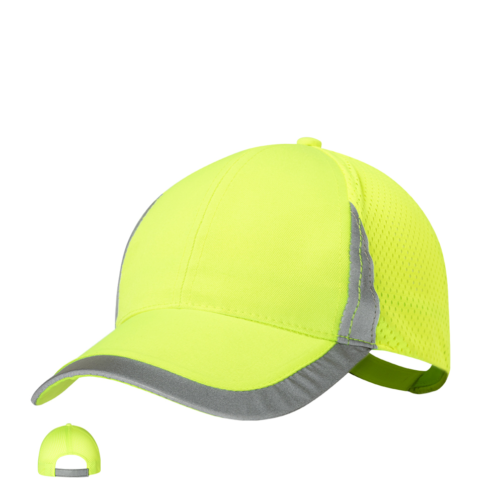Sportpet met van zacht polyester. Verstelbare klittenbandsluiting en ademend gaas aan de achterkant. In fluorescerende kleur met reflecterende elementen in vizier, frontpanelen en sluiting.