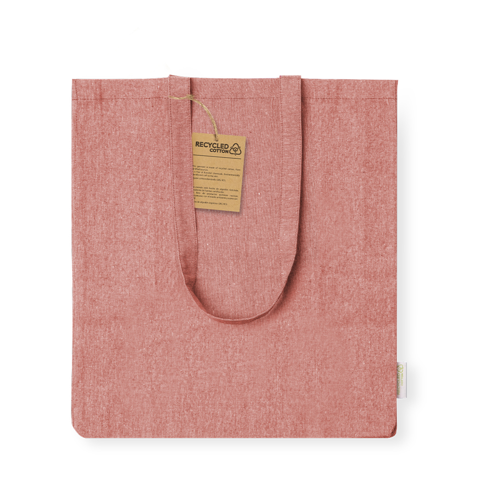 Tas van gerecycled katoen 140 g/m2. Lange hengsels van 70cm met versteviging, gestikte afwerking en kruisje. Label van gerecycled katoen en weerstand tot 8 kg in gewicht. Verkrijgbaar in een breed scala aan eco-kleuren, gecombineerd met een natuurlijke basis.