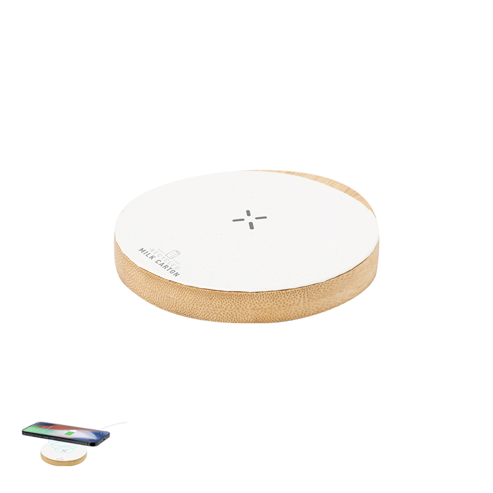 Draadloze oplader 15W met ronde vorm. Met oplaadoppervlak van gerecycled materiaal uit melkpakken en basis van bamboe, compatibel met apparaten uitgerust met Qi draadloze oplaadtechnologie. Type C oplaadkabel meegeleverd, met logo gerecyclede melkpakken in laadstation. Niet -slip bamboe basis en gepresenteerd in een individuele doos met kraft-ontwerp.Gebruiksaanwijzing in het Engels en Spaans. Melkpakken zijn meestal gemaakt van karton en aluminium. Tijdens het recyclingproces worden de verschillende verpakkingsmaterialen gescheiden voor hergebruik en herbestemming, en dragen zo bij aan het oneindige pad van de circulaire economie. Dit materiaal staat bekend om zijn hoge recycleerbaarheid, maar ook om zijn lichtgewicht en weerstand. Materialen zoals bamboe stimuleren het gebruik van natuurlijke grondstoffen, waardoor de uitstoot van verontreinigende stoffen wordt verminderd. Het is afkomstig van een zeer resistente en veelzijdige plant met een snelle groei en regeneratie, waardoor het een uitstekend alternatief is voor traditioneel hout. Gefabriceerd volgens RoHS-normen en in overeenstemming met de volgende veiligheidseisen: Beveiligingssysteem tegen oververhitting. Beveiligingssysteem tegen overbelasting. Blokkeersysteem om kortsluiting te voorkomen.