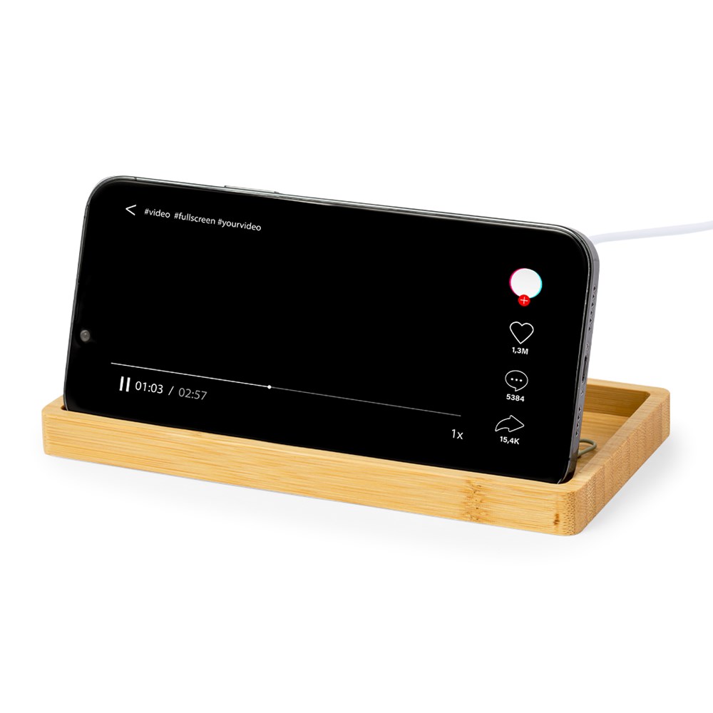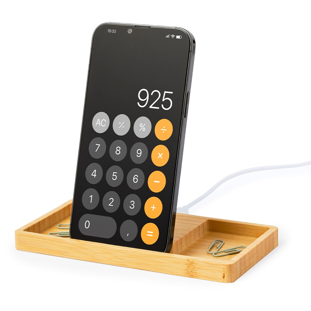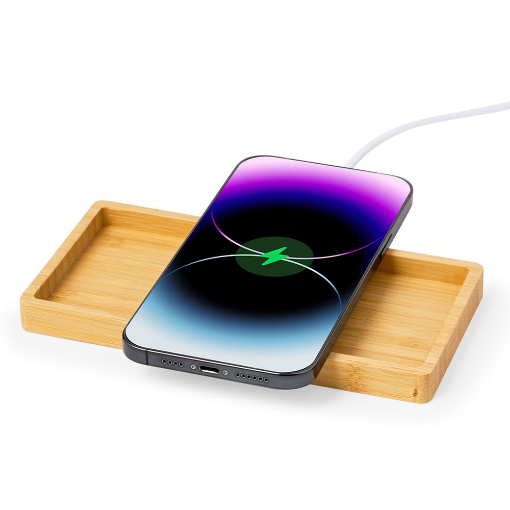 "Draadloze oplader en organizer 15W, gemaakt van bamboe. Met smartphonehouderfunctie en extra compartimenten voor voorwerpen, compatibel met apparaten uitgerust met draadloze oplaadtechnologie. Groot merkoppervlak en gepresenteerd in een individuele kraftdoos. Handleiding in het Engels en Spaans beschikbaar.Materialen zoals bamboe stimuleren het gebruik van natuurlijke grondstoffen, waardoor de uitstoot van verontreinigende stoffen wordt verminderd. Het is afkomstig van een zeer resistente en veelzijdige plant met een snelle groei en regeneratie, waardoor het een uitstekend alternatief is voor traditioneel hout.Gefabriceerd volgens RoHS-normen en in overeenstemming met de volgende veiligheidseisen: Beveiligingssysteem tegen oververhitting. Beveiligingssysteem tegen overbelasting. Blokkeersysteem om kortsluiting te voorkomen."