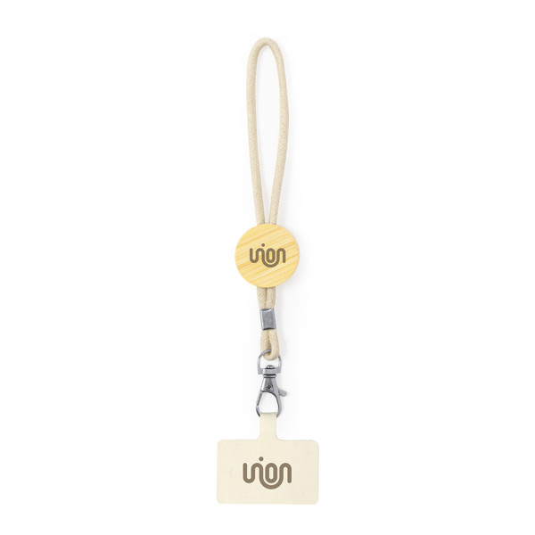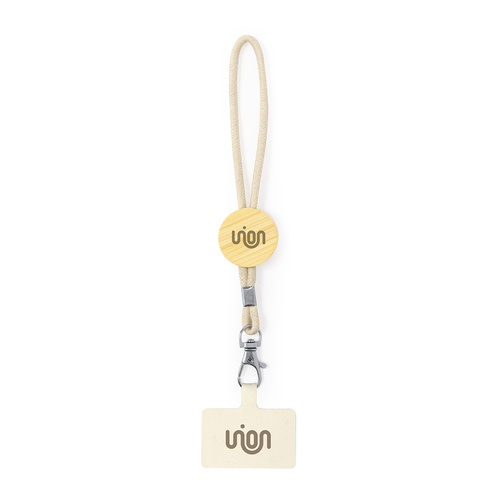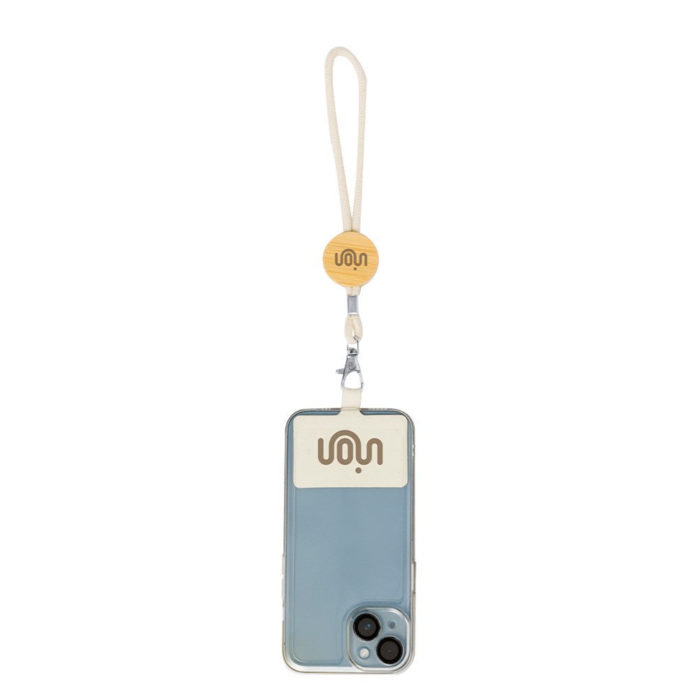 Originele polsband van zacht katoen, met mobiele houderfunctie en aanpasbaar aan alle soorten polsen. Met draagaccessoire om tussen de case en de smartphone te plaatsen. Middenstuk van bamboe voor personalisatie, speciaal ontworpen voor lasergraveren. Individueel gepresenteerd in een gerecyclede papieren zak .
