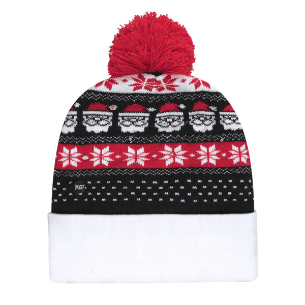 Kerstmuts met LED-licht en pomponontwerp. Voorzien van 6 meerkleurige LED's met zowel vaste als knipperende lichtopties (knoopcelbatterij inbegrepen). Gemaakt van zacht acryl. Een ideaal cadeau om de kou te bestrijden en een vleugje warmte en plezier toe te voegen.