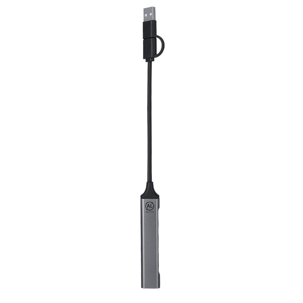 USB Hub gemaakt van gerecycled aluminium. Met dubbele USB/Type C-aansluiting en 4 poorten: 1 Type C-aansluiting 2.0 en 3 USB-poorten. Met gerecycled aluminium logo.Gerecycled aluminium is een materiaal met bijna oneindige recyclingmogelijkheden, zonder zijn oorspronkelijke eigenschappen te verliezen en met minder energieverbruik in het proces.GRS (Global Recycled Standard) certificering, die de gerecyclede oorsprong van het materiaal dat voor de productie van het product wordt gebruikt, garandeert.
