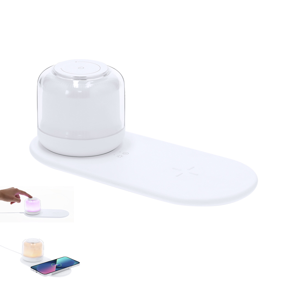 Multifunctionele lamp. Het omvat:- Draagbare draadloze oplaadlamp met 12 LED's. Daarnaast heeft het 2 lichtposities die verstelbaar zijn via touch-knoppen: één positie in wit licht en een andere in verschillende kleuren.- 15W draadloze oplader.