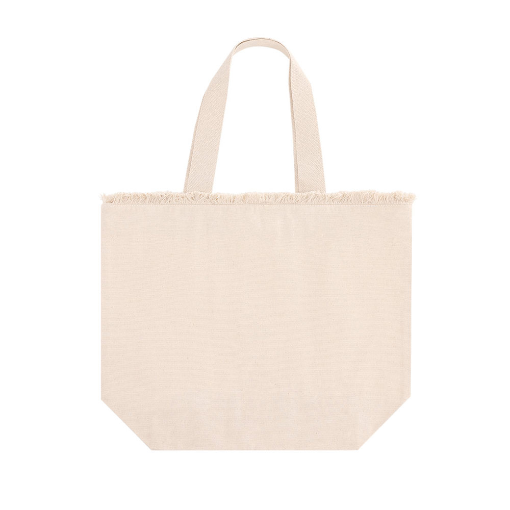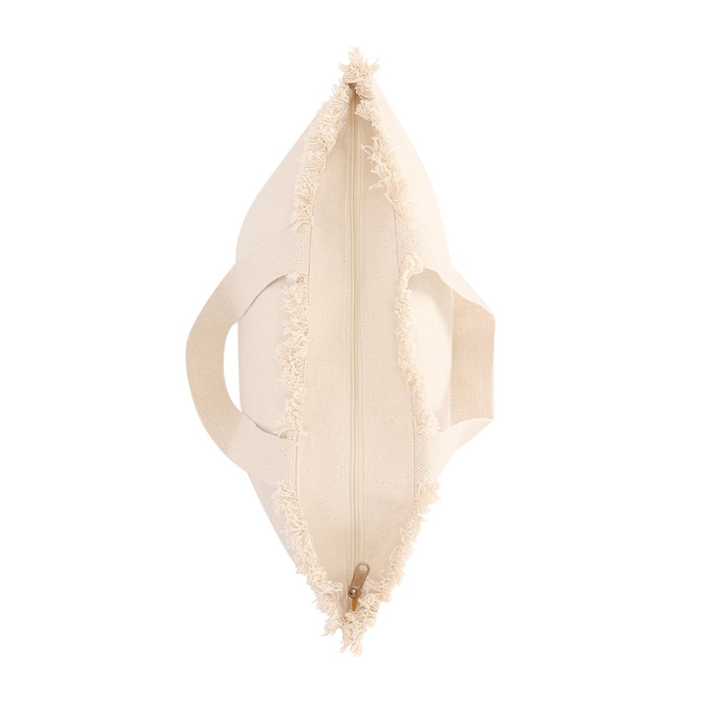 Tas met franjes, gemaakt voornamelijk van 320 g/m2 katoen. Praktisch en modern ontwerp met lange versterkte handgrepen. Inclusief ritssluiting voor extra veiligheid.