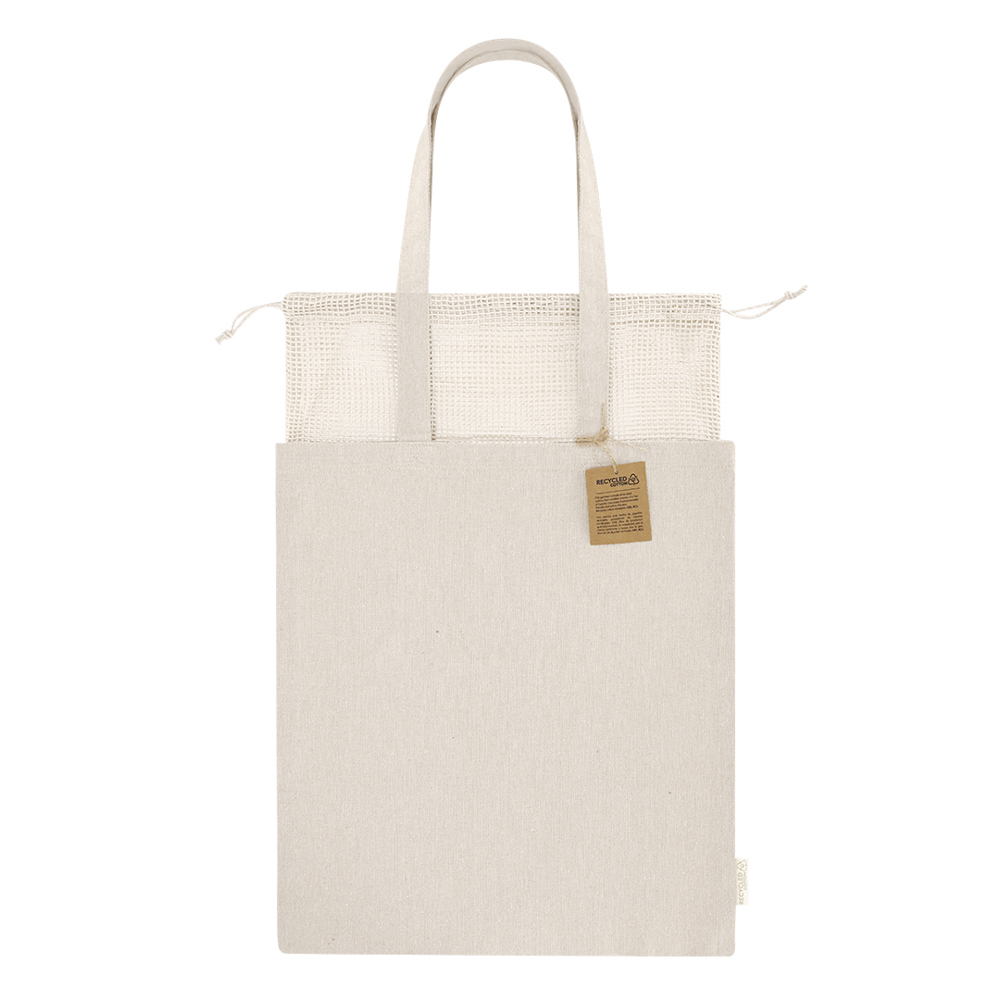 Tas voornamelijk gemaakt van gerecycled katoen van 260 g/m2 met bovenste sluiting met koord, gemaakt van netstof. Lange handgrepen van 70 cm met versteviging en gestikte afwerking. Logo op zijlabel en weerstand tot 8 kg.