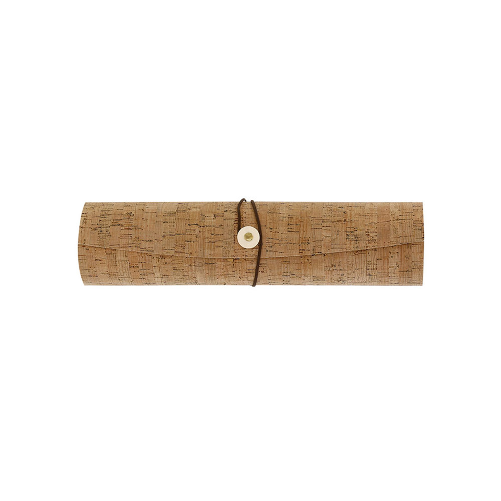 Presentiedoos met een binnenkant van natuurlijk hout en een buitenkant van kurk. Heeft een sluiting met een bruine riem.