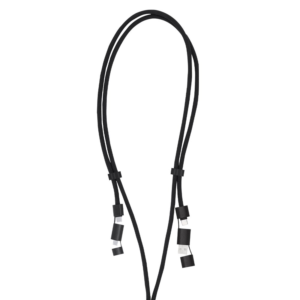 Innovatieve lanyard met functie van houder en oplaadsnoer, gemaakt van een combinatie van RPET polyester en gerecycled aluminium. Ontworpen om gemakkelijk tussen het hoesje en de smartphone te worden geplaatst dankzij het transportaccessoire. Inclusief bijpassende band, draaibare metalen karabijnhaak in zwarte kleur en veiligheidsaccessoire voor de nek. Biedt oplaadfunctie en gegevensoverdracht, met USB- en Type C-ingang, en Micro USB-, Lightning- en Type C-uitgangen. Toont een RPET-onderscheidingsmerk op kraftlabel, waarmee zijn duurzame inzetbaarheid wordt benadrukt.Het RPET-materiaal wordt gemaakt van gerecycled plastic om hergebruik van plastic afval te bevorderen en om de duurzaamheid van de planeet te ondersteunen.Gerecycled aluminium is een materiaal met bijna eindeloze recyclingmogelijkheden, zonder zijn oorspronkelijke eigenschappen te verliezen en met minder energieverbruik in dit proces.GRS-certificering (Global Recycled Standard), die de gerecycleerde oorsprong van het materiaal dat is gebruikt voor het maken van het product garandeert.
