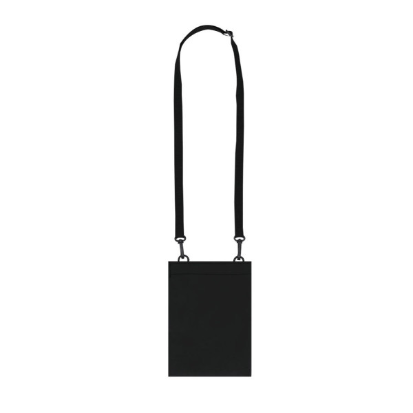 Etui gemaakt van zacht PU. Hoofdcompartiment met klittenbandsluiting en ruime ingang met uitrekbare bodem. Inclusief platte verstelbare riem met dubbele karabijnhaak.