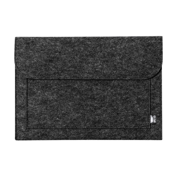 Natuurlijn laptophoes van resistent, gerecycled RPET-vilt. Het resultaat van de combinatie van de recyclageprocessen van plastic materialen samen met de duizendjarige techniek van viltproductie, wat resulteert in een eco-trendmateriaal dat niet alleen van gerecycleerde oorsprong is, maar ook recycleerbaar wordt. Klep met klittenbandsluiting en voorvak, met RPET-embleem op het buitenlabel.