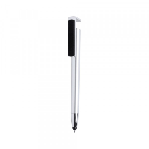 Multifunctionele stylus balpen met push-up-mechanisme in felle kleuren en clip met dubbele functie, speciaal ontworpen om te functioneren als houder voor mobiele apparaten en ook als schermreiniger. Met body in metallic afwerking, speciaal ontworpen voor tampondruk. Zwarte inkt.