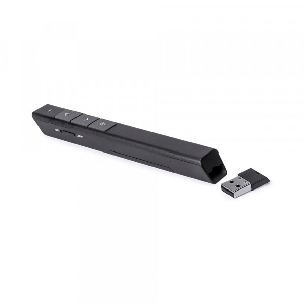 Stijlvolle, hoge kwaliteit, laserpointer met USB-aansluiting. speciaal ontworpen voor PowerPoint- en Keynote-presentaties. Activeringsknoppen aan de zijkant met functies voor vooruit, pauze en achteruit spoelen. Met body speciaal ontworpen voor tampondruk en op batterijen: 1 x AAA inbegrepen. Gepresenteerd in een elegante en stevige zwarte kartonnen doos met zacht schuim aan de binnenzijde en een batterijvak.