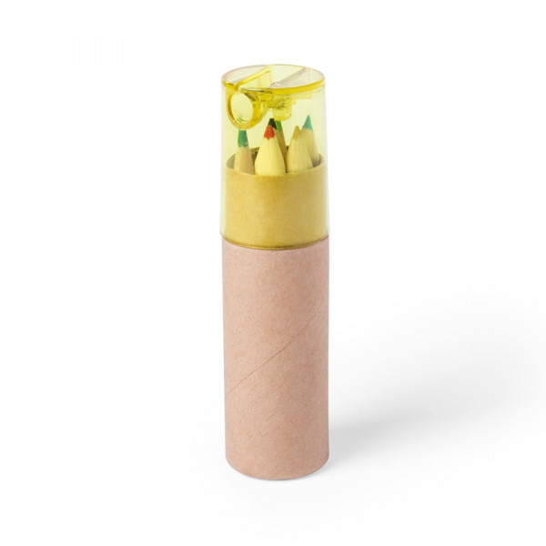 Set van 7 stuks kleurpotloden in een kartonnen doos met met natuurlijke kleur en transparante deksel in gevarieerde kleuren. Inclusief 6 houten potloden met natuurlijke afwerking, met een zeshoekige body. Ingebouwde puntenslijper.