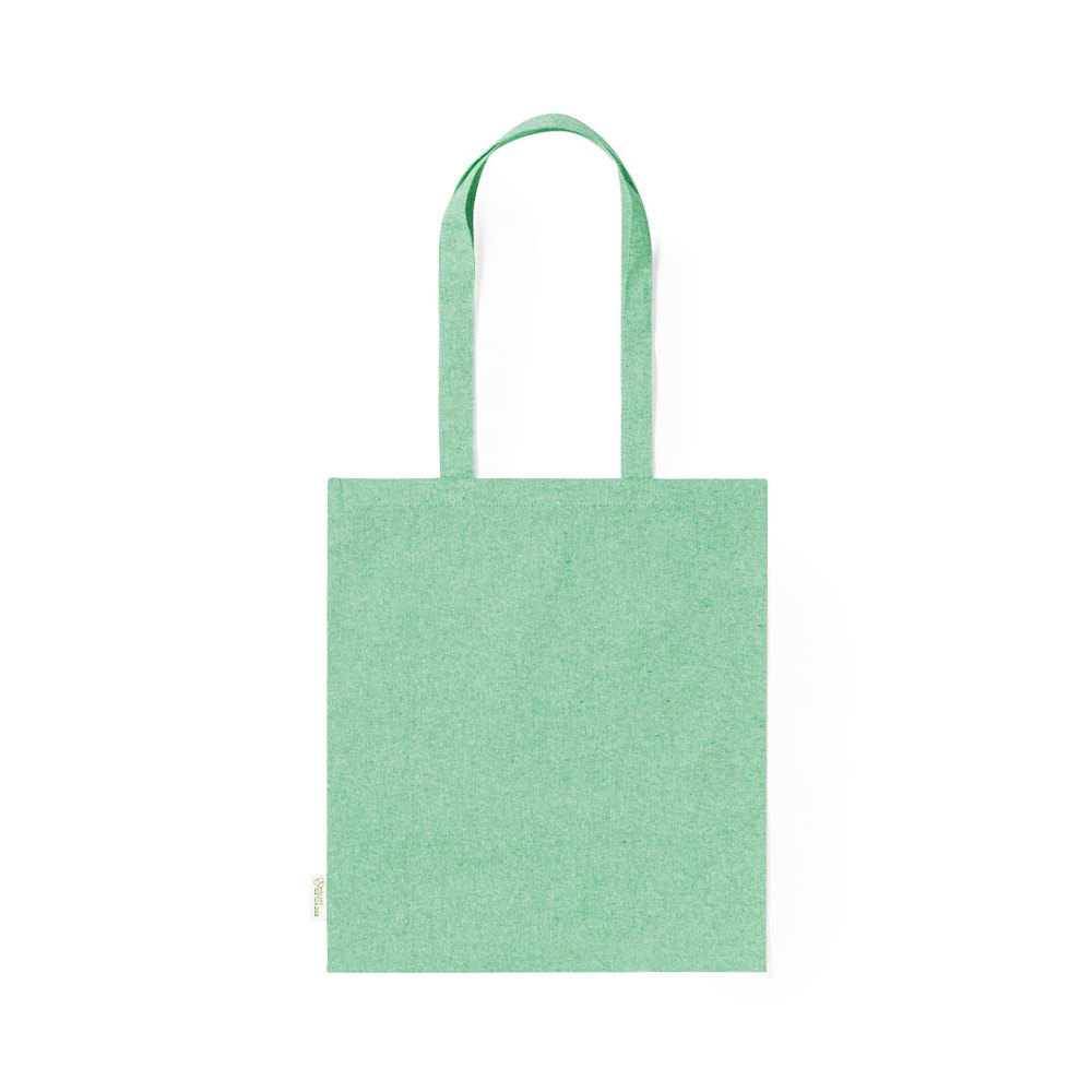 Tas gemaakt van gerecycled katoen materiaal 140g/m2. GRS-certificaat (Global Recycled Standard), dat de gerecycleerde herkomst garandeert van het materiaal dat voor de vervaardiging van het product is gebruikt. Gestikte afwerking, met een lengte van 70 cm, versterkte handgrepen, en verkrijgbaar in een brede waaier van kleuren. Weerstand tot 8 kg, inclusief embleem van gerecycleerd katoen op het etiket.