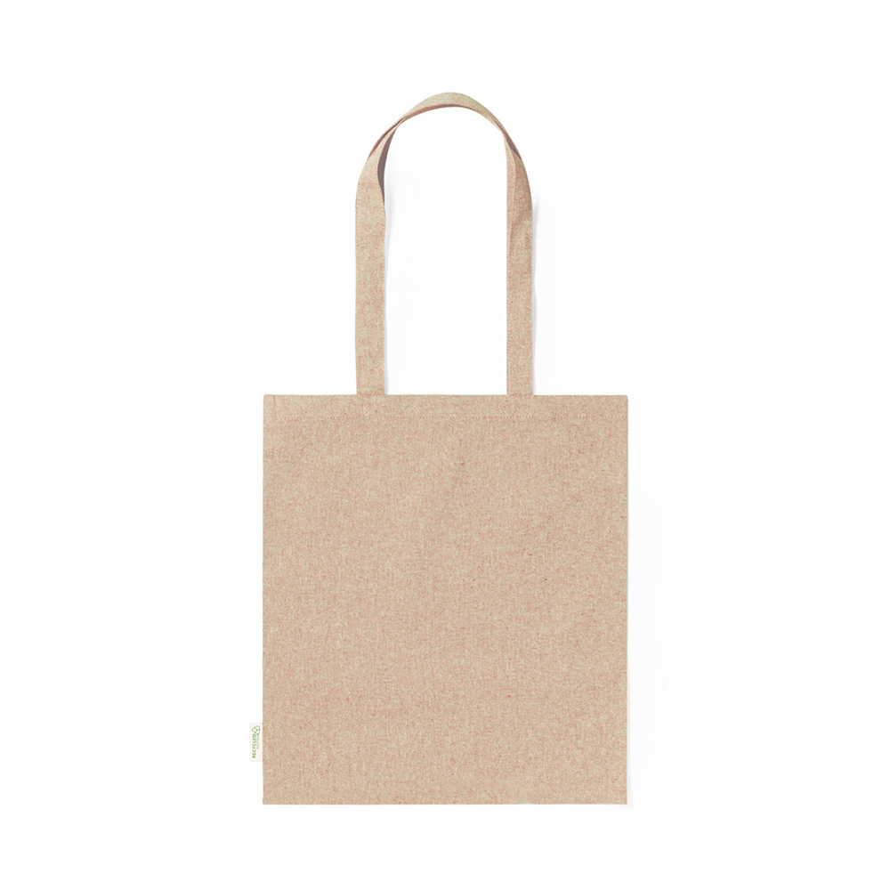 Tas gemaakt van gerecycled katoen materiaal 140g/m2. GRS-certificaat (Global Recycled Standard), dat de gerecycleerde herkomst garandeert van het materiaal dat voor de vervaardiging van het product is gebruikt. Gestikte afwerking, met een lengte van 70 cm, versterkte handgrepen, en verkrijgbaar in een brede waaier van kleuren. Weerstand tot 8 kg, inclusief embleem van gerecycleerd katoen op het etiket.