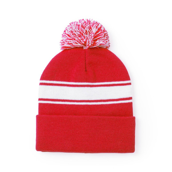 Zachte en warme muts gemaakt van acryl, in diverse kleuren. Origineel ontwerp, met witte strook en tweekleurige pom pom in bijpassende kleur.