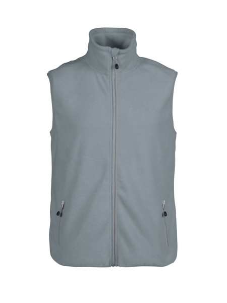 Geborstelde bodywarmer met lange ritssluiting voor dames en heren. Geborsteld aan beide zijden. Twee voorzakken, contrasterende ritssluitingen en decoratieve stiksels. Elastische tape aan de boord onderaan.