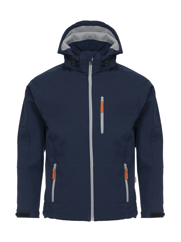 Softshell jas met contrasterende microfleece aan de binnenzijde. Wind- en waterbestendig (WP3000/MVP2000), afritsbare capuchon en manchetten verstelbaar met velcro. Elastisch trekkoord met stopper aan de capuchon en onderaan de zoom. Eén borstzak, twee zijzakken en één binnenzak.
