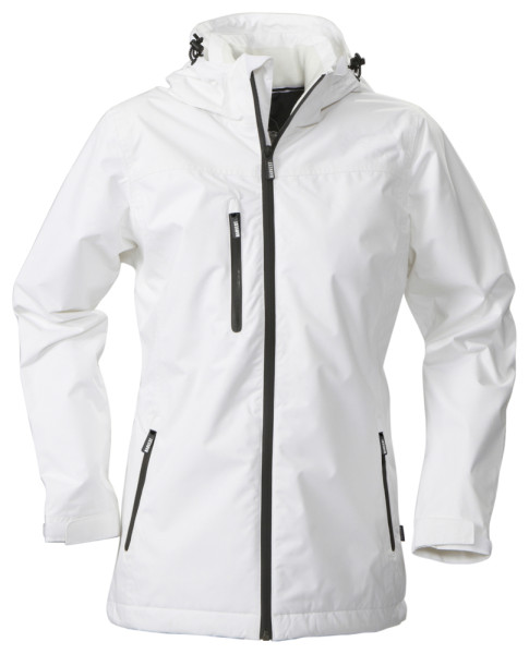 Functionele sportjas voor dames met getapete naden en waterdichte ritssluitingen. Verborgen ritssluiting op de rug en aan de capuchon voor het makkelijk aanbrengen van borduring en/of druk. Afneembare capuchon en elastische trekkoorden aan de zoom.