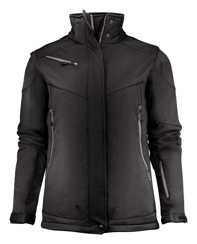 Gevoerde softshell met afneembare capuchon, voorgevormde mouwen en trekkoord onderaan de zoom. De mouwen zijn verstelbaar met een velcro. Voorzakken en borstzak met ritssluiting, twee binnenzakken met ritssluiting en een zak in membraanvoering. Standaard wordt deze jas geleverd met zwarte zippullers. De zippullers kunnen indien gewenst vervangen worden door één van de andere beschikbare kleuren.