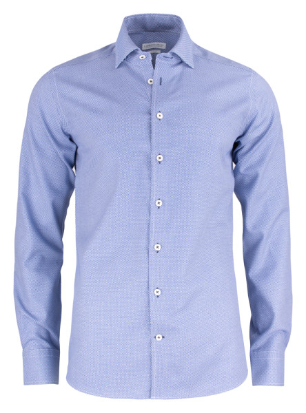 Blauw/wit patroon shirt. Een dubbele 100's jacquard stof, met een mooi modern micro-patroon. Combineer het met het volledige pak of een meer ontspannen look samen met jeans, hoe dan ook, het zal je goed van pas komen. Onze nieuwe ontwikkelde stof is gemaakt met een mechanische stretch voor een beter comfort. De mechanische stretch is een nieuwe innovatieve manier om comfort te geven aan een 100% natuurlijke compacte katoenen stof. Het geeft een natuurlijke elasticiteit aan het hemd van maximaal 12% bewegingbereikbaarheid. Dit hemd is ook nog steeds non-iron.