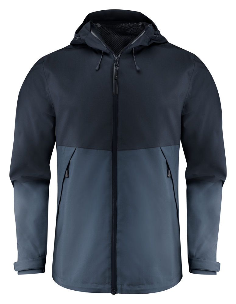 Functionele, bicolor shelljas met getapete naden. Waterdichte ritssluiting vooraan en omgedraaide nylon ritssluitingen aan de zijzakken. Aanpasbare velcrosluiting aan de manchetten. Mesh binnenvoering met linkerbinnenzak en borduurrits. Reflecterende tag in middenrug. De capuchon en de zoom zijn aanpasbaar met elastische trekkoorden.