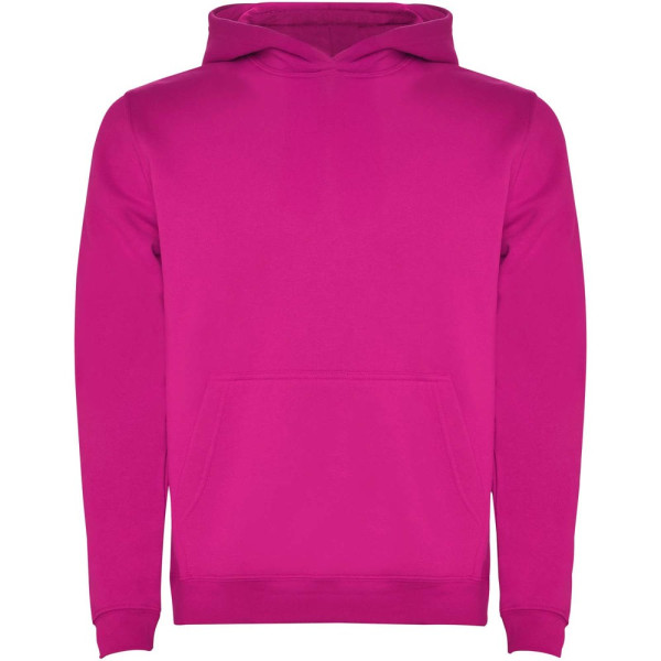 Tweekleurige hoodie met dubbele stof. Versterkte bedekte naden in de kraag en kangoeroezak. 1x1 elastaan rib in manchetten en tailleband. Verwijderbaar etiket. Het model is 120 cm en draagt maat 5/6.