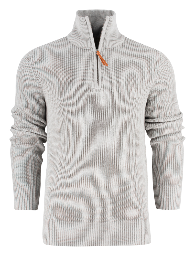 Zwaar gebreide vest met korte ritssluiting in metaal met leren zippuller. Elleboogstukken (platgebreid in dezelfde garen) op de mouwen. Ribboord aan de manchetten, de zoom onderaan en de dubbelgelaagde kraag.