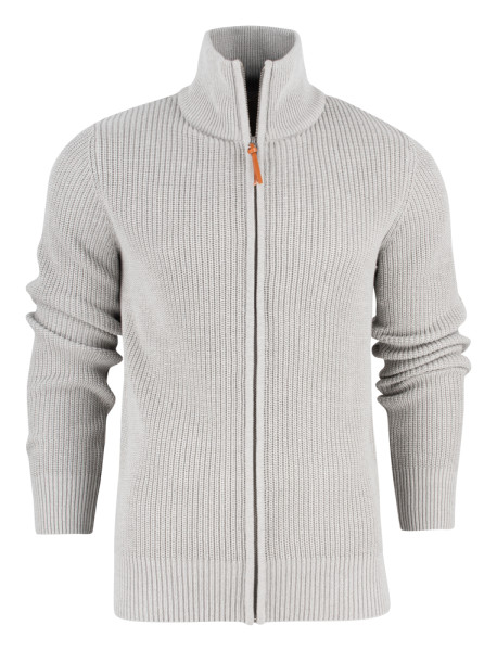 Zwaar gebreide vest met volledige ritssluiting in metaal met leren zippuller. Elleboogstukken (platgebreid in dezelfde garen) op de mouwen. Ribboord aan de manchetten, de zoom onderaan en de dubbelgelaagde kraag.