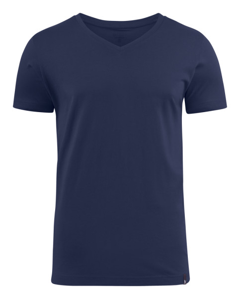 V-hals t-shirt met tweelagige ribboord aan de kraag. De stof is ringgesponnen en nabehandeld met een enzyme wash, waardoor het materiaal voorgekrompen is en zacht aanvoelt. Oeko-Tex 100 gecertificeerd.