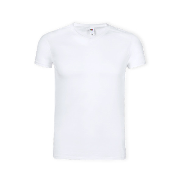 Wit T-shirt voor volwassenen Iconic V-Neck van Fruit Of The Loom. Gemaakt van 100% geruwde katoen Ring Spun 140g/m2. Zachte touch en moderne snit, met smalle 1x1 geribde V-hals en bijpassende placket. Gemakkelijk verwijderbaar label en verkrijgbaar in de maten S, M, L, XL, XXL.