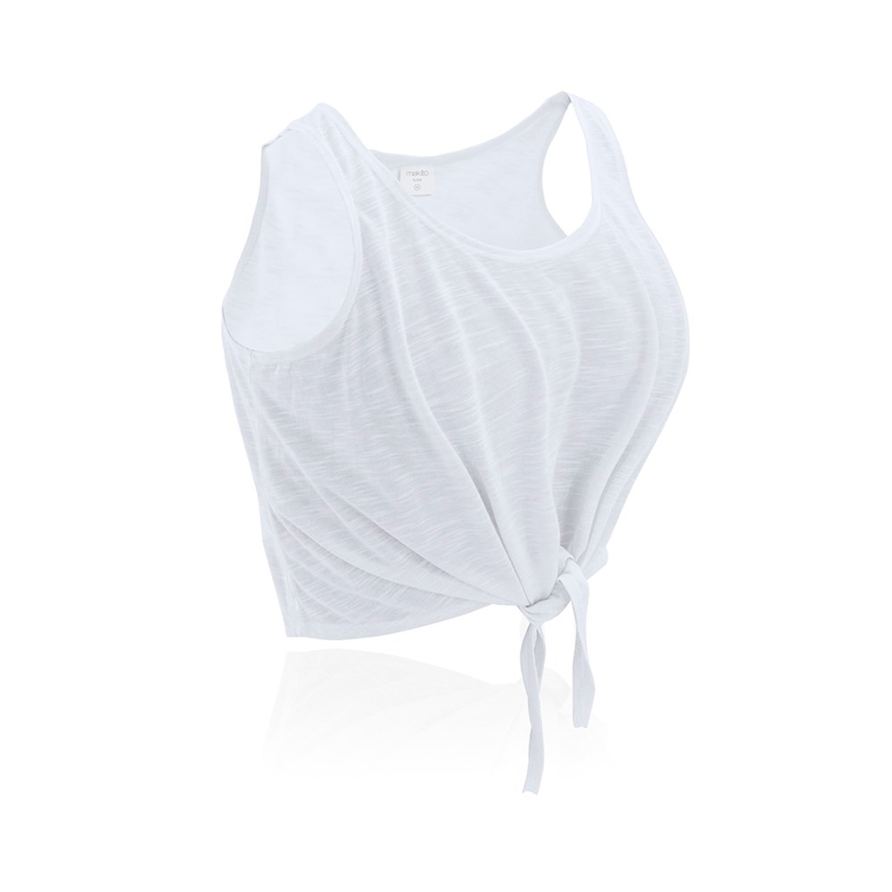 T-shirt voor dames van zacht polyester 130 g / m2. Geknoopt aan de voorzijde. Verkrijgbaar in het wit en felle fluorescerende kleuren. Maten S, M, L.